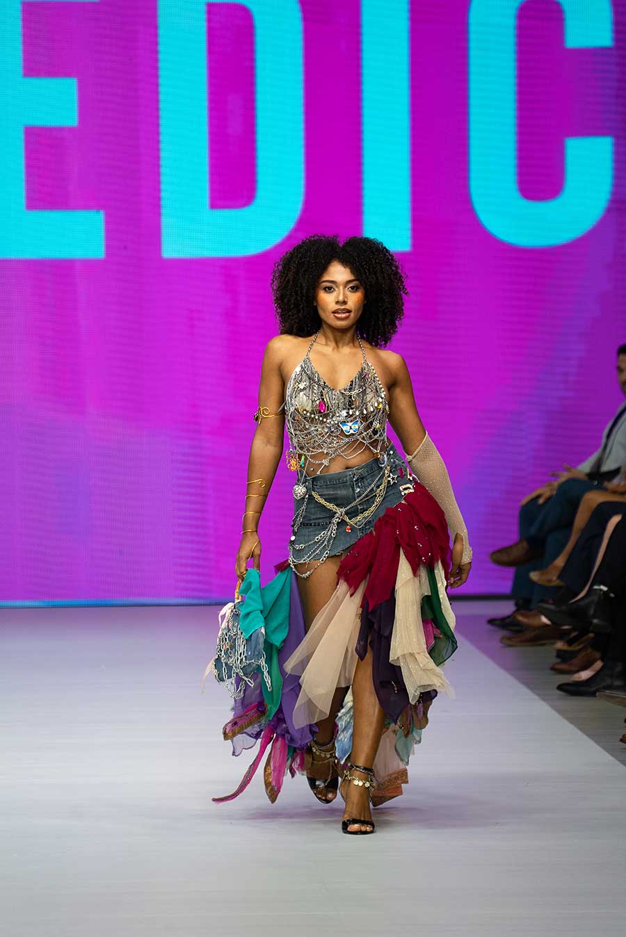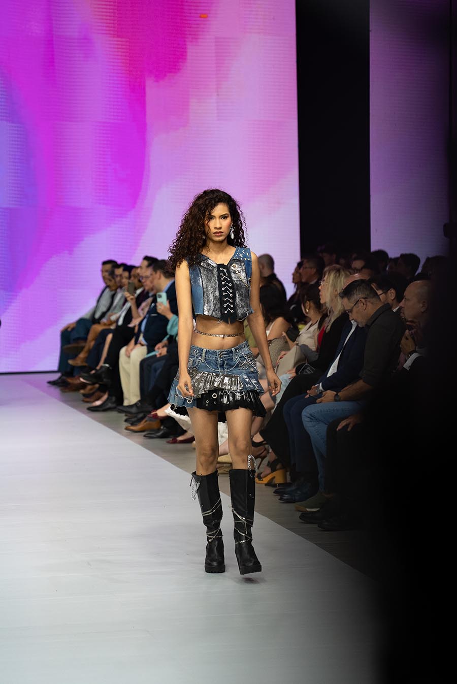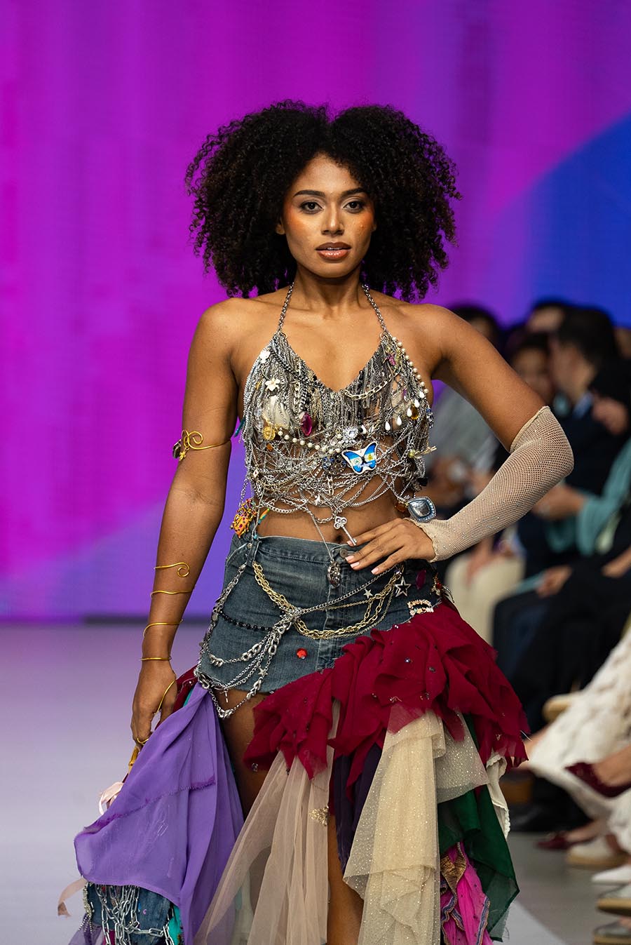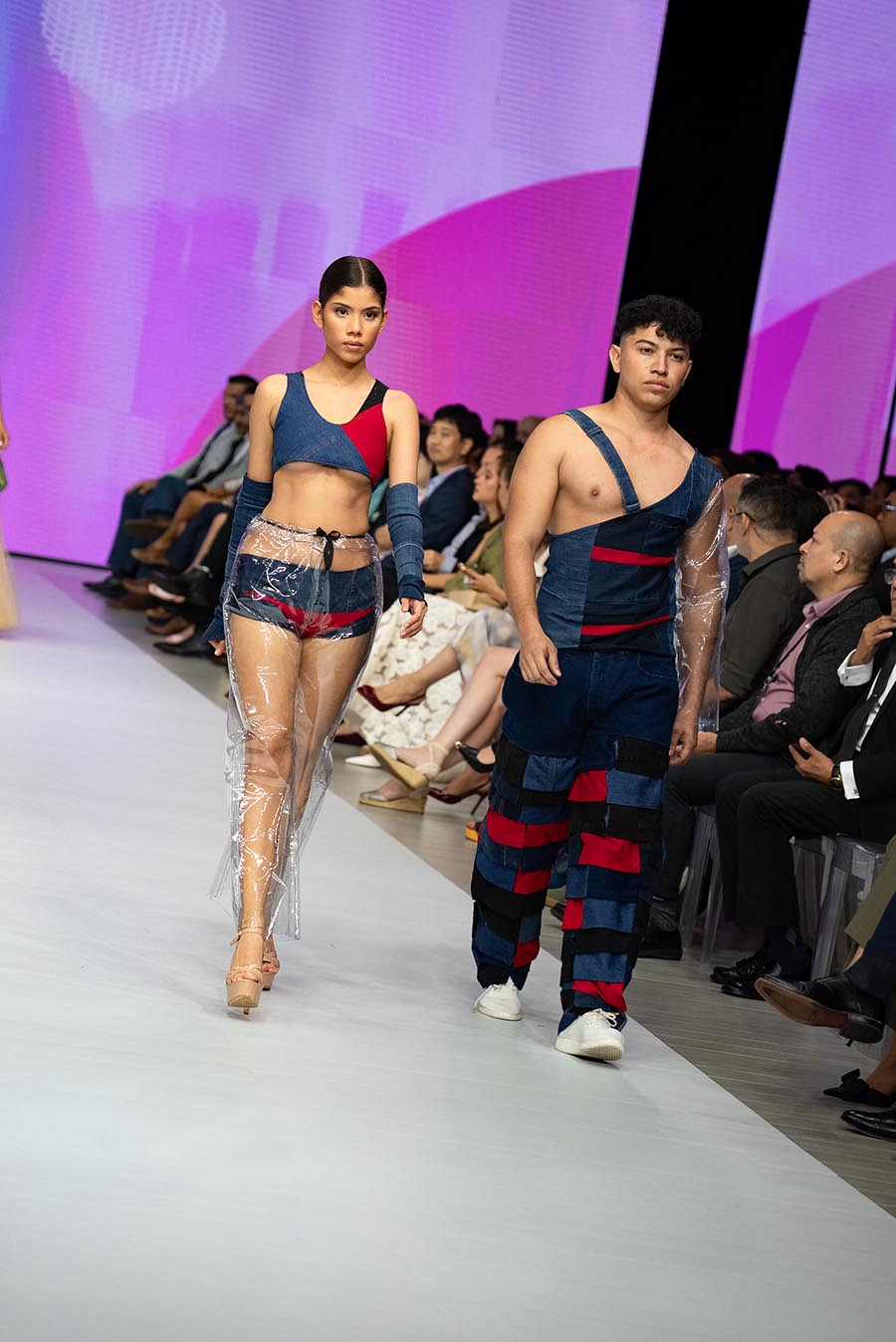 El resultado fue un desfile vibrante compuesto por jeans reinventados, calzado intervenido, accesorios desbordantes y materiales inesperados como plástico, alambres o resina. Cada detalle reflejó la visión de una generación que entiende que vestir el futuro es también cuidar del planeta.