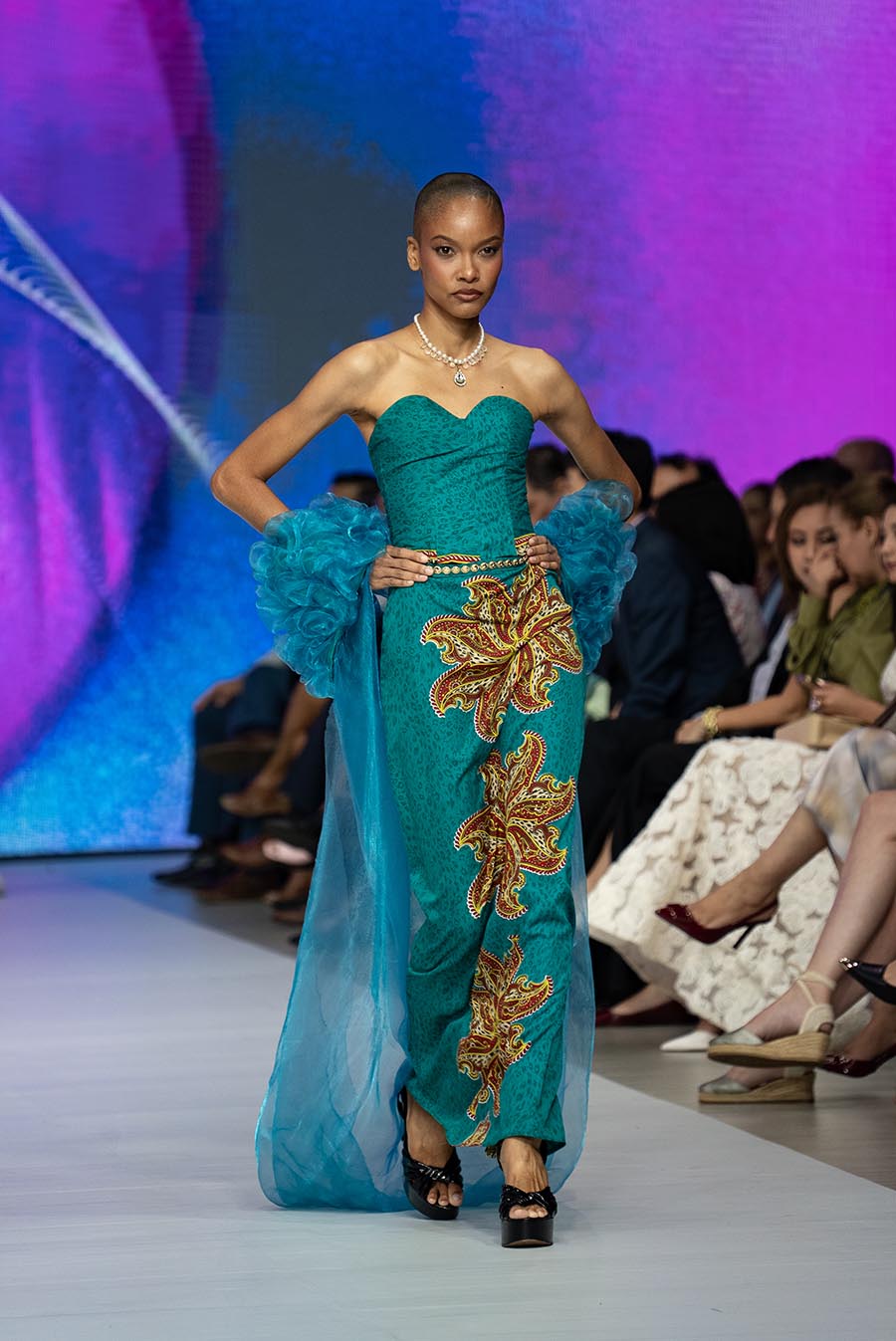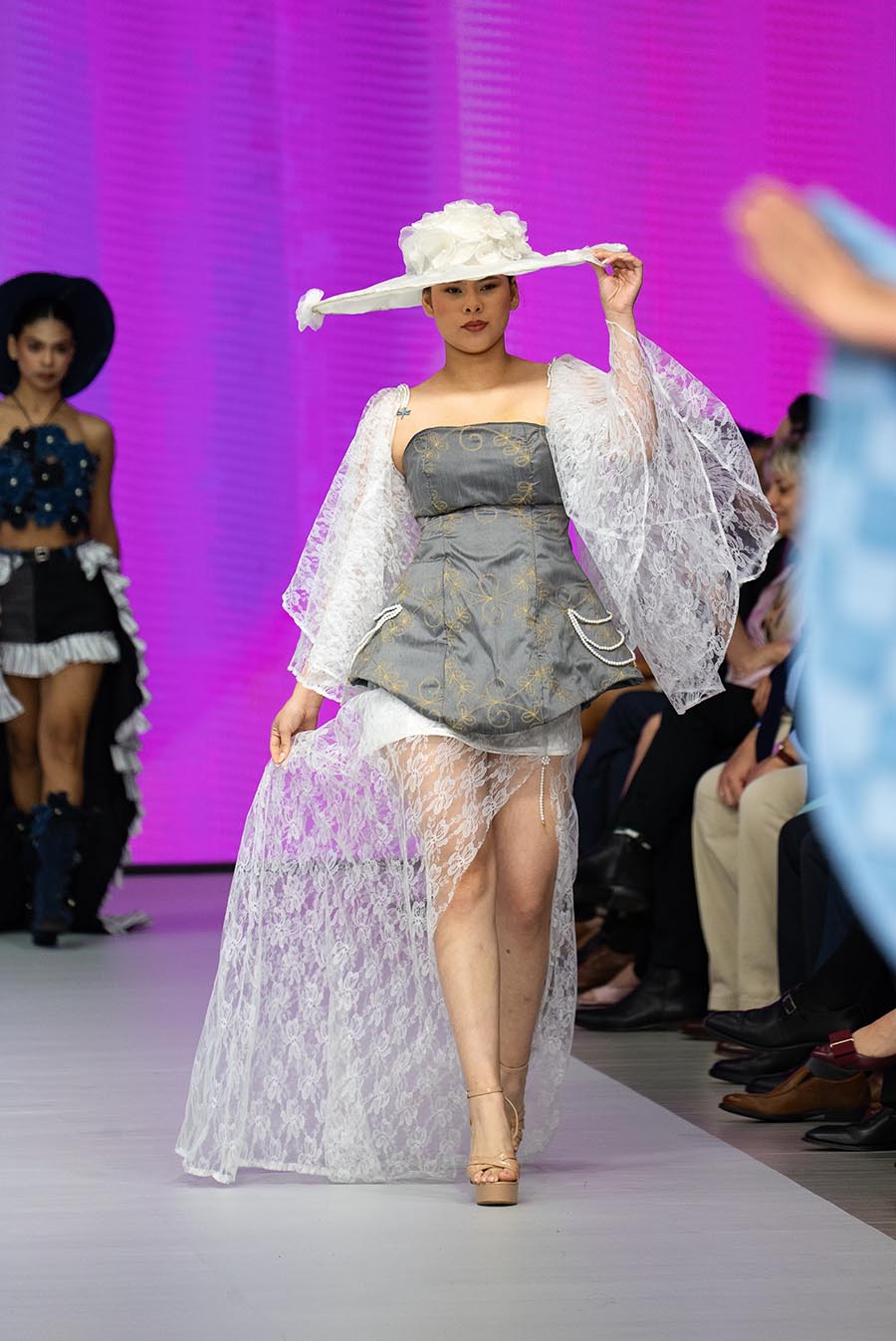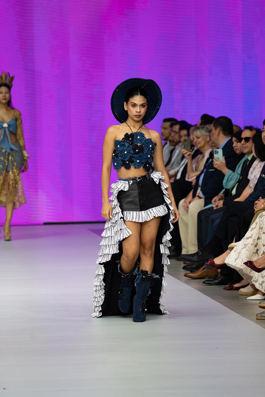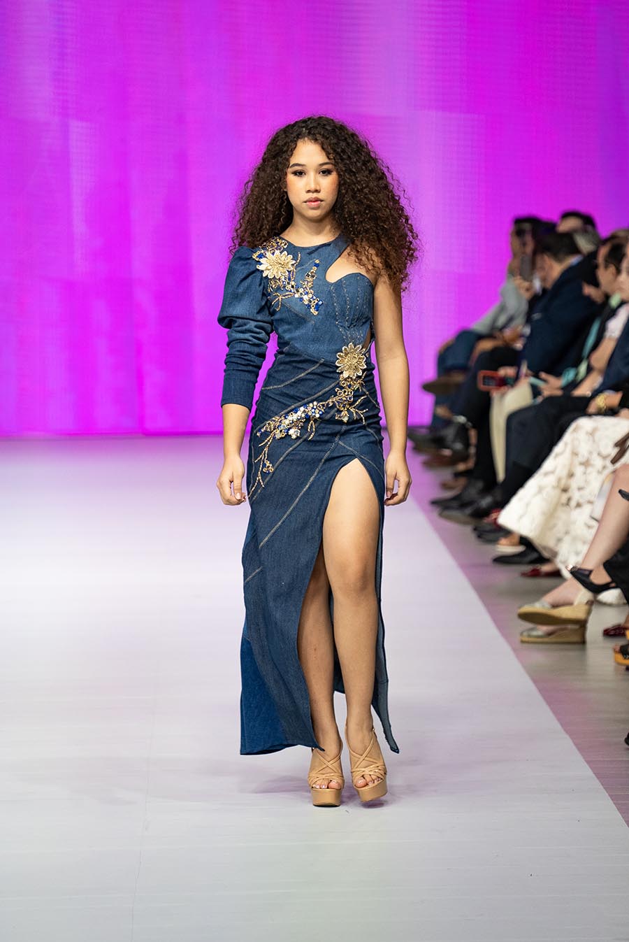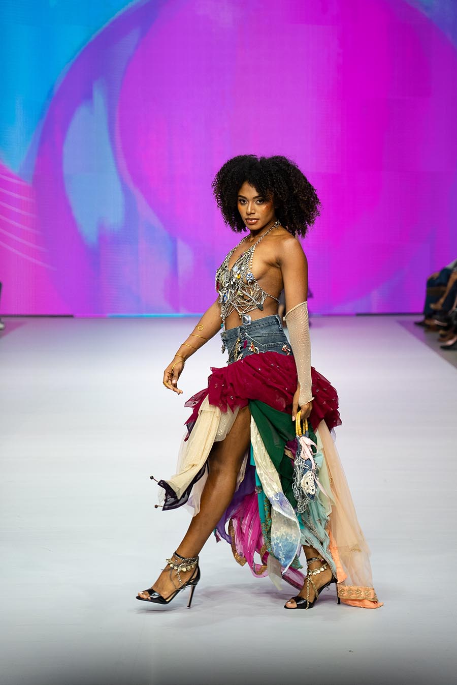 El resultado fue un desfile vibrante compuesto por jeans reinventados, calzado intervenido, accesorios desbordantes y materiales inesperados como plástico, alambres o resina. Cada detalle reflejó la visión de una generación que entiende que vestir el futuro es también cuidar del planeta.