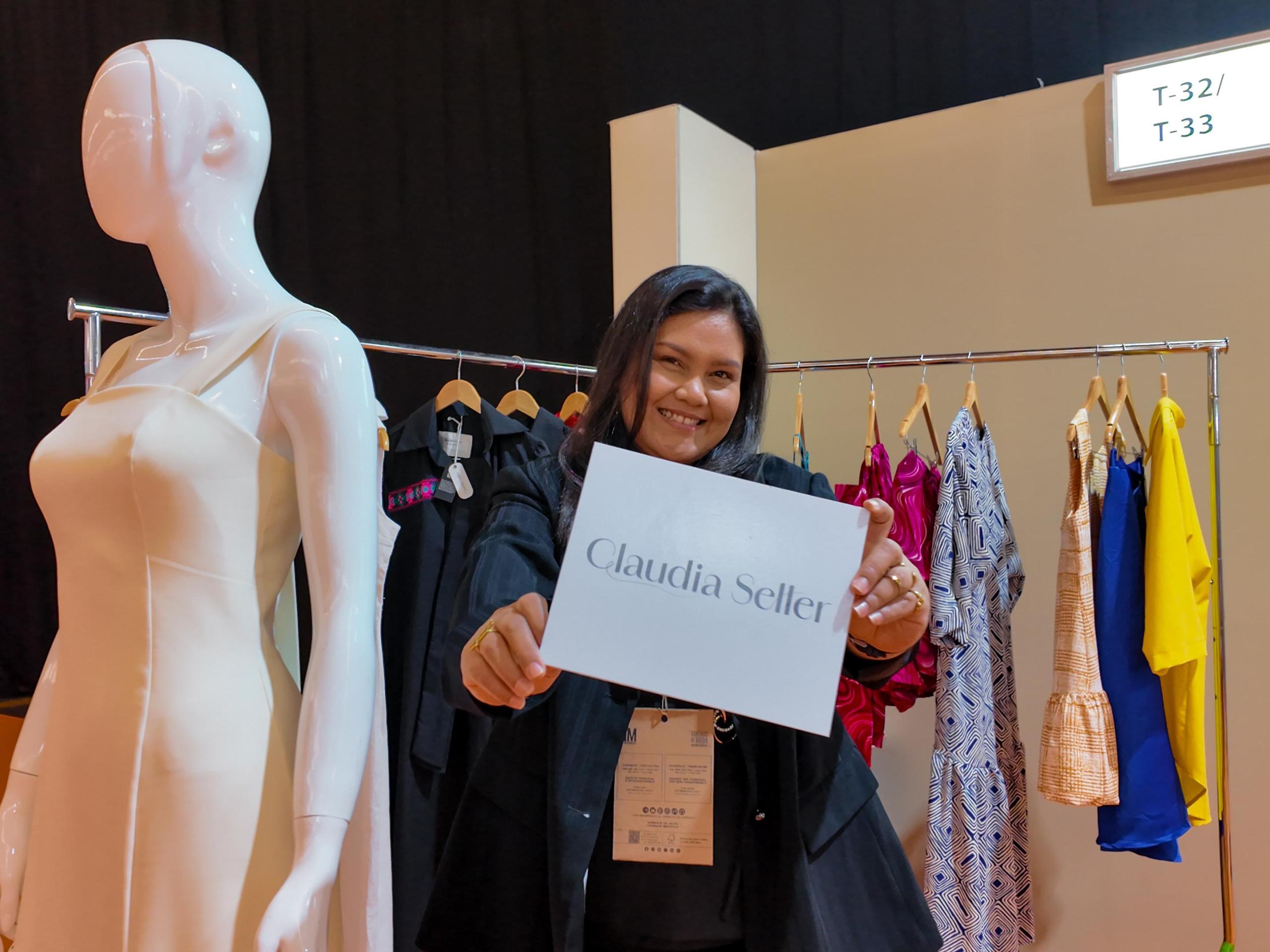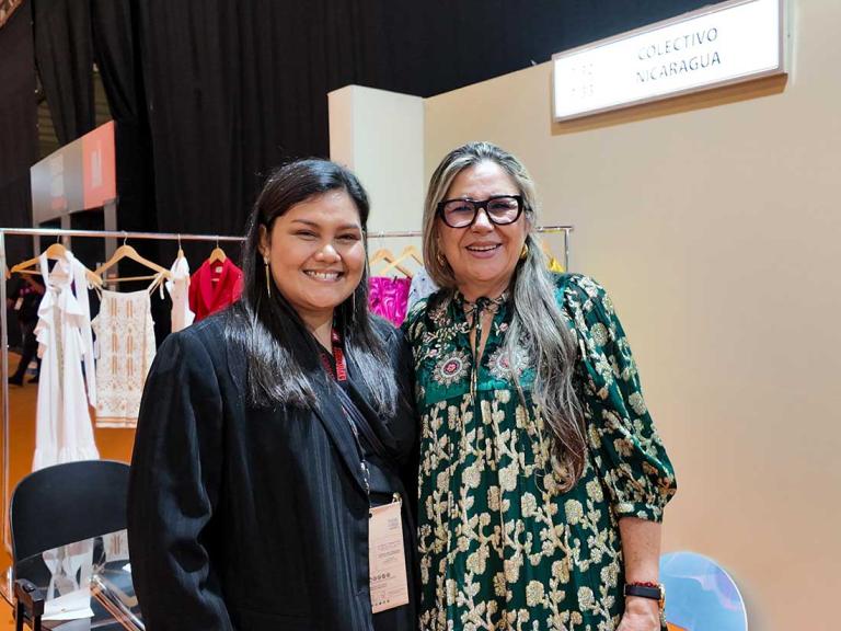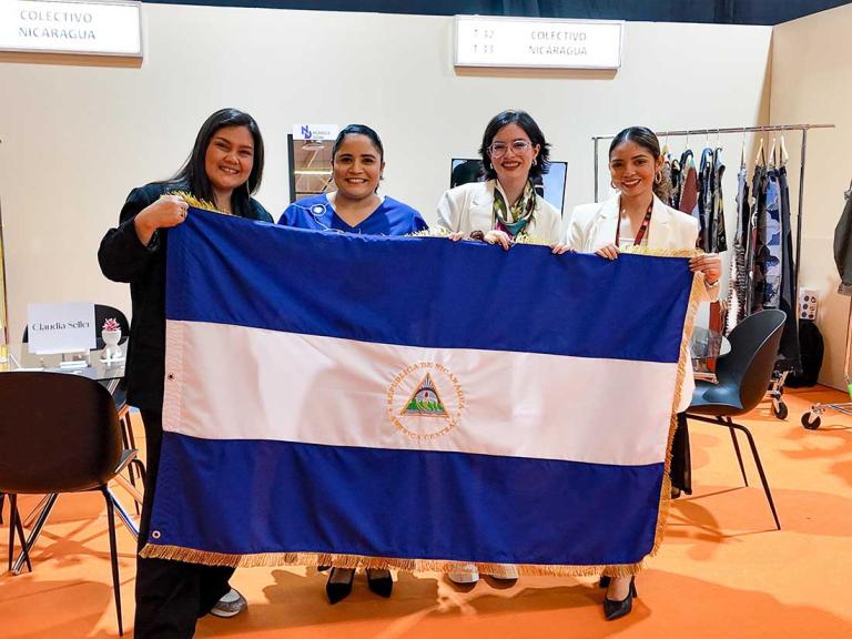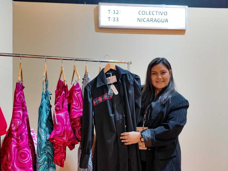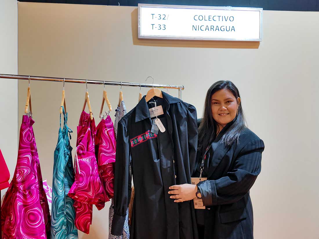 La diseñadora Claudia Seller, egresada del Técnico Especialista en Diseño y Comercialización de Moda. En el 2023 Claudia participó en la pasarela “Moda por una Causa” en El Salvador, representando a Nicaragua como estudiante de la Escuela Creativa junto a otros diseñadores y docentes afiliados a Nicaragua Diseña. La experiencia incluyó el uso de la tela innovadora SINCATEX fabricada por INSINCA, y además tuvo la oportunidad de conocer de primera mano el proceso industrial desde la fibra hasta el producto textil final.